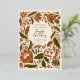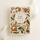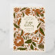 This Christmas card design features a vibrant, festive of elegant floral and bird illustrations on a warm, ivory background. The artwork is embellished with a combination of moody olive green and rust red foliage and large flowers, giving it a classic holiday look. A delicate, illustrated bird adds charm and movement, while real metallic foil line-work accents enhance the seasonal warmth.