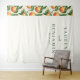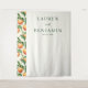 This elegant wedding backdrop features a balanced vertical layout with a repeating pattern of realistic peach illustrations on the left, adding a touch of natural whimsy. The right side offers ample negative space, highlighting customizable text in a sophisticated serif font that guides the eye gracefully across the design. With a warm color palette of soft oranges and rich greens, this piece exudes a mood of classic elegance and warmth, perfect for celebrating your special day.
