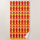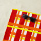 This beach towel has an Art Deco design of a plaid with thick and thin lines in red, orange, and yellow.