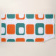 This beach towel has a mid-century modern design of repeating orange rectangles with white rectangles inside alternating with teal rectangles.