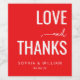 This wedding wine label features a bold, minimalist design with a vibrant red background and crisp white text. The layout is symmetrical, with the words "LOVE" and "THANKS" prominently displayed in modern sans-serif fonts, complemented by an elegant cursive script for "and." Perfect for expressing gratitude and love, this customizable label allows you to add names and dates, making it ideal for celebrating special occasions like weddings. The clean aesthetic and warm tone convey sophistication and heartfelt appreciation.