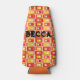 This bottle cooler has a mid-century modern design of rectangles stacked three thick in warm colours of red, orange, gold, and yellow on a field of white.