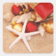 A gift wrapped box, overflowing with shells and ornaments on a sandy beach. Perfect for a warm weather Christmas! Totally customisable for you to personalise as you please!