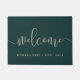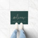 A great gift for newlyweds or new homeowners, our personalized welcome doormat in rich hunter green features "welcome" in modern, elegant handwritten calligraphy script. Personalize with your family name and year established in classic block lettering.