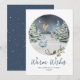 Elegant Christmas card featuring a watercolor nighttime winter scene complete with a starry, moonlit sky, beautiful pine trees, an owl, and snow on the ground. Pine cones and winter foliage accent the circular winter scene. "Warm Wishes" is displayed in a dark blue script with your name and the year shown below. The non-photo holiday card reverses to display a dark blue background with a white snowy design.