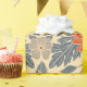 This gift wrap has flowers and leaves in shades of yellow, orange, and blue-grey on a cream-coloured background.