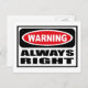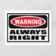 Warning ALWAYS RIGHT Postcard you can customise at www.WarningSignShirts.com and features a red and black warning sign and ALWAYS RIGHT in bold black letters to warn the world. You can also customise your own warning sign Postcard with the text you want.