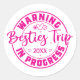 This fun round sticker features the bold text "Warning: Besties Trip in Progress" with a customisable year. The design colour and year can be changed to any shade you like, allowing you to match it with your preferred background colour. Perfect for decorating luggage, travel journals, party favours, or gifts for your bestie getaway. A great keepsake for bachelorette parties, girls' trips, or any unforgettable adventure with friends!