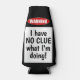 This funny beer bottle cooler or foam holder reads: Warning: I have NO CLUE what I'm doing! The back has a similarly funny message which reads: Disclaimer: The person drinking this beverage has absolutely no clue what they are doing. Please take appropriate precautions. If you know someone who likes to drink beer, and perhaps gets a tiny bit tipsy on occasion, this foam bottle cooler is the perfect gag gift. Sure to get a laugh at any picnic, BBQ, tailgate, or party!