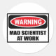 Warning MAD SCIENTIST AT WORK Sticker you can customise at www.WarningSignShirts.com and features a red and black warning sign and MAD SCIENTIST AT WORK in bold black letters to warn the world. You can also customise your own warning sign Sticker with the text you want.