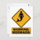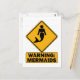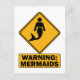 This diamond-shaped warning sign design shows the silhouette of a mermaid with text below reading "Warning: Mermaids."