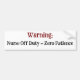 Warning: Nurse Off Duty = Zero Patience Sarcasm Bumper Sticker