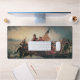 Vintage illustration travel and transportation design featuring a fine art Victorian Era painting titled Washington Crossing the Delaware, 1851. By artist Emanuel Leutze. It commemorates General George Washington's crossing of the icy Delaware River during the American Revolutionary War with military soldiers carrying the American Flag on the night of December 25th, 1776. That historical action was the first move in a surprise attack against the Hessian forces at Trenton, New Jersey in the Battle of Trenton. The flag of the United States of America at this time was not the current stars and stripes that is pictured, the historically accurate flag would have been the Grand Union Flag, officially hoisted by Washington himself on January 2, 1776.