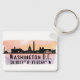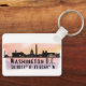 Keychain features Washington DC city skyline silhouette with watercolor splash and latitude & longitude map coordinates