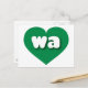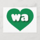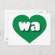 This postcard features a vibrant green heart containing the bold, white, rounded lower case letters wa, a playful abbreviation for Washington, the evergreen state. The reverse side of the card is blank, awaiting your handwritten sentiments or customised text.