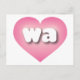 This postcard features a pink heart with a white-washed centre containing the bold, white, rounded lower case letters wa, a playful abbreviation for Washington, the evergreen state. The reverse side of the card is blank, awaiting your handwritten sentiments or customised text.