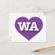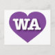 This postcard features a vibrant purple heart containing the bold, white, upper case letters WA, the official abbreviation for Washington, the evergreen state. The reverse side of the postcard is blank, awaiting your handwritten sentiments or customised text. Choose font style, size, and colour.