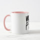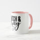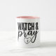 Beautiful Watch & Pray ceramic coffee mug. White outside with a colour glazed handle and interior. The designed is wrapped around the front of the mug setting it apart from the usual two-sided designs.