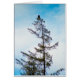 A photograph of an American Bald Eagle perched atop a tall Pine Tree. A blue sky with misty clouds are in the background. Traces of sunlight and snow can be found on the tree and it's branches.