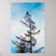 A photograph of an American Bald Eagle perched atop a tall Pine Tree. A blue sky with misty clouds are in the background. Traces of sunlight and snow can be found on the tree and it's branches.