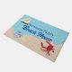 Water (with a boat) meets sand (with a crab and flip flops) for a beach house welcome mat with your family name.