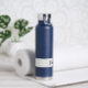 This insulated water bottle is shown in navy blue with a custom sample name.