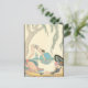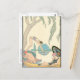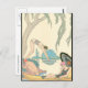 Art Deco style Illustration by George Barbier of a Young woman wearing a floral print bathing suit and pink cap holding an Asian style parasol while lounging in a boat. To the left of the woman is a small shoreline with one in the buff bather and one diving bather.