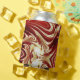 An abstract art design of swirling river water with red, gold and white colours.