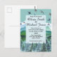 Beautiful and stylish wedding invitation with muted water colour mountains and pine trees. Blues and greens.