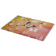 This glass cutting board, has aged art work there is also dew and dew droplets along with a few butterflies.