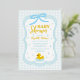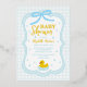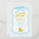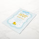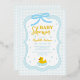 Baby blue gingham baby shower with a hand drawn bow. Water droplets frame a rubber duck surrounded by bubbles