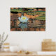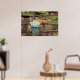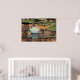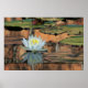 This poster features an original photo of a quiet, summer pond. A graceful, white water lily takes centre stage, surrounded by lily pads dotted with water and reflections of the pond wall beyond.