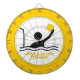 Water polo player black silhouette dart board featuring a minimalist pictogram icon of a black silhouette of a water ball player holding his ball in front of the goal and your text on white background with yellow border. The perfect gift for the water polo athlete or lover in your life.