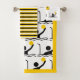 Water polo player black silhouette, monogram and stripes bathroom towel set design. It showcases a minimalist pictogram icon of a black silhouette of a water ball player holding his ball in front of the goal. The hand towel includes a striped pattern in yellow, black and white and the washcloth is of white colour with your monogram and the same icon.