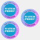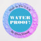 "Water Proof" Sticker in bold white text in blue circle with blue and purple water drops background. Comes with two extra text lines: Made In The U.S.A. and name. Personalise message and photo to your needs. Place on packages, etc.
