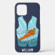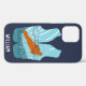 Create a personalised gift that's perfect for water-skiers and water sports enthusiasts. This cell phone case features an illustration of a water-skier in orange, light blue and teal blue set in the shape of a life jacket vest against a navy blue background. Below is a spot to add a name in white lettering.
