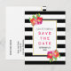 Pretty pink and purple tropical watercolor flowers, chic black and white striped pattern and your text on a white frame adorn this outstanding wedding Save the Date postcard. Choose it for your spring or summer wedding.