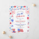 Patriotic items rendered in a watercolor effect surround this 4th of July party invitation. A red, white, and blue banner hangs from the top while a star pattern creates a celebratory background. The reverse is a different pattern of hand-painted watercolor stars. Celebrate with friends and family at an Independence Day party, fireworks display, BBQ, or community event. Available with matching products.