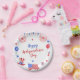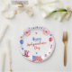 Patriotic items rendered in a watercolor effect surround this 4th of July party paper plate. A red, white, and blue banner hangs from the top while a star pattern creates a celebratory background. Celebrate with friends and family at an Independence Day party, fireworks display, BBQ, or community event. Available with matching products.