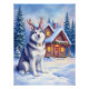Celebrate the holidays with this adorable watercolor Christmas card featuring a fluffy Alaskan Malamute wearing playful reindeer antlers. Set beside a snowy cabin glowing with colorful lights, this cozy winter scene brings seasonal charm to every mailbox. Ideal for dog lovers, pet parents, and breed enthusiasts, this card’s blank interior makes it easy to personalize with heartfelt holiday greetings. A warm and cheerful way to share festive spirit.