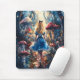 A whimsical watercolor design featuring Alice walking along a woodland path lined with red cap mushrooms, capturing the magical charm of Wonderland.