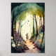 Cute kids illustration of a fable character standing on a path in a magical forest filled with flowers.