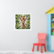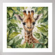 Beautifully detailed and realistic illustration of a young giraffe surrounded by lush green leaves. The giraffe’s expressive eyes and intricate detailing give it a lifelike appearance, making the artwork captivating and engaging.