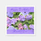 These premium quality disposable napkins feature an original impressionistic digital watercolor painting of pink and lavender blue Hydrangea bushes by artist, Leslie Sigal Javorek, w/ batik inspired elements, wide orchid colour borders at top & bottom and 2 custom text fields to personalise for any occasion and any name. See coordinating designs and party supplies at HoMeArts. Available in 3 sizes.
