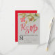 Red watercolor berries and golden branches create a beautiful Boho design. RSVP is written across the entire RSVP card in a red brush stroke font. The remainder of the text is a simple black modern block text.