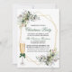 Elegant Watercolor Greenery Christmas Party Invitation includes beautiful watercolor botanical greenery, eucalyptus leaves, holly berries and other beautiful foliage. Gold Geometric Frame. Red Script. Champagne Glass with Green Bow.
