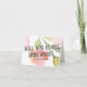 A pretty and modern "will you be my bridesmaid" note card featuring a pink and green floral watercolor background, the phrase "will you be my bridesmaid" in dark grey brush lettered font, and a solid green back.