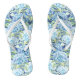 These women's flip flops feature a blue hydrangea watercolor pattern.