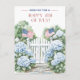 Charming Happy 4th of July postcard featuring a serene watercolor illustration of a white garden gate framed by lush blue hydrangeas and adorned with two waving American flags. The elegant design and patriotic flair make it a sophisticated way to share your holiday wishes with friends and family.