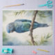This delicate watercolor painting features a charming blue parakeet perched on a eucalyptus tree branch, surrounded by soft green leaves. The gentle brushstrokes and soothing colour palette create a peaceful and nature-inspired scene, perfect for bird and botanical art lovers.